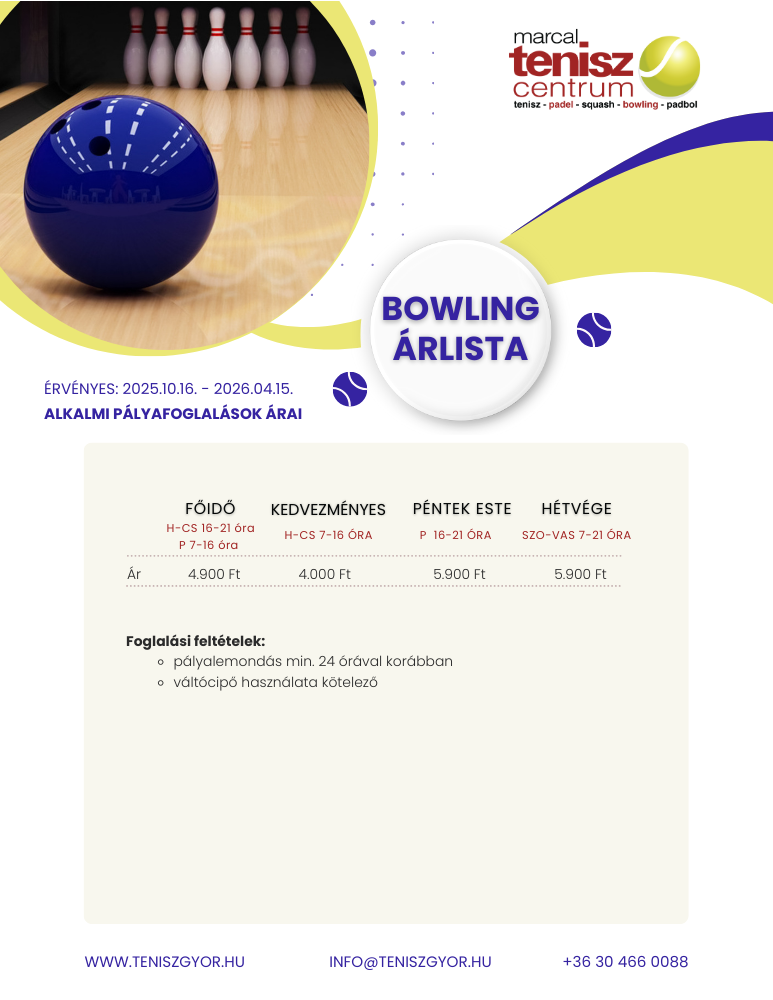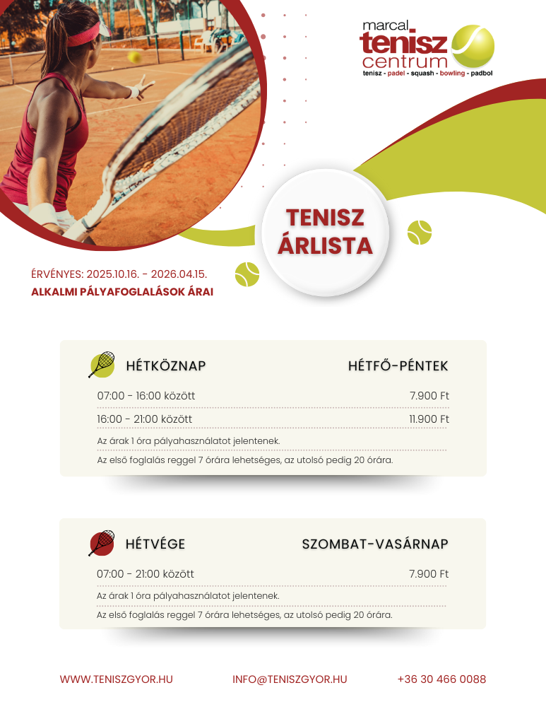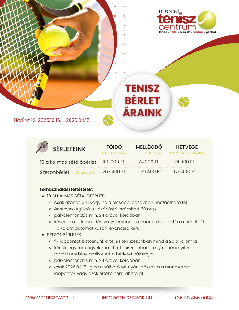 2006. április 1-én nyitottuk meg sportközpontunkat Győrben, a Pápai út mellett, a Marcal szomszédságában. 7 salakos teniszpálya, 3 fallabda pálya, 2 bowling pálya, fitnesz terem, asztali tenisz, tollaslabda, szauna, büfé, masszázs, szépségszalon áll a vendégeink rendelkezésére.